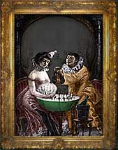 L' Amour de Pierrot Haunted Portraits is proud to introduce L'Amour de Pierrot I have to say I'm pretty pumped about my latest work. I ran across an old photo card on eBay from the late 1800s when I was looking for some images to work my magic on and I found a most unusual one. You can see that image here at the bottom of the page. Even though I love the image it really didn't lend it's self well to a morph so I started digging around for other treasures out there when I ran across this strange illustration and instantly knew I had to figure out a way to turn it into a changing portrait. This is the first time I've ever worked backwards. By that I mean that usually I start with a normal image and transform it into something wicked. In this case I had dark image I had to sanitize for the normal image. By adding color and darkening the background I changed it into a very normal looking image. But as with all my works as you walk by it changes from the normal to the strange. I hope you enjoy my latest work as much as I do. To visit it's new section in our Gallery go here |